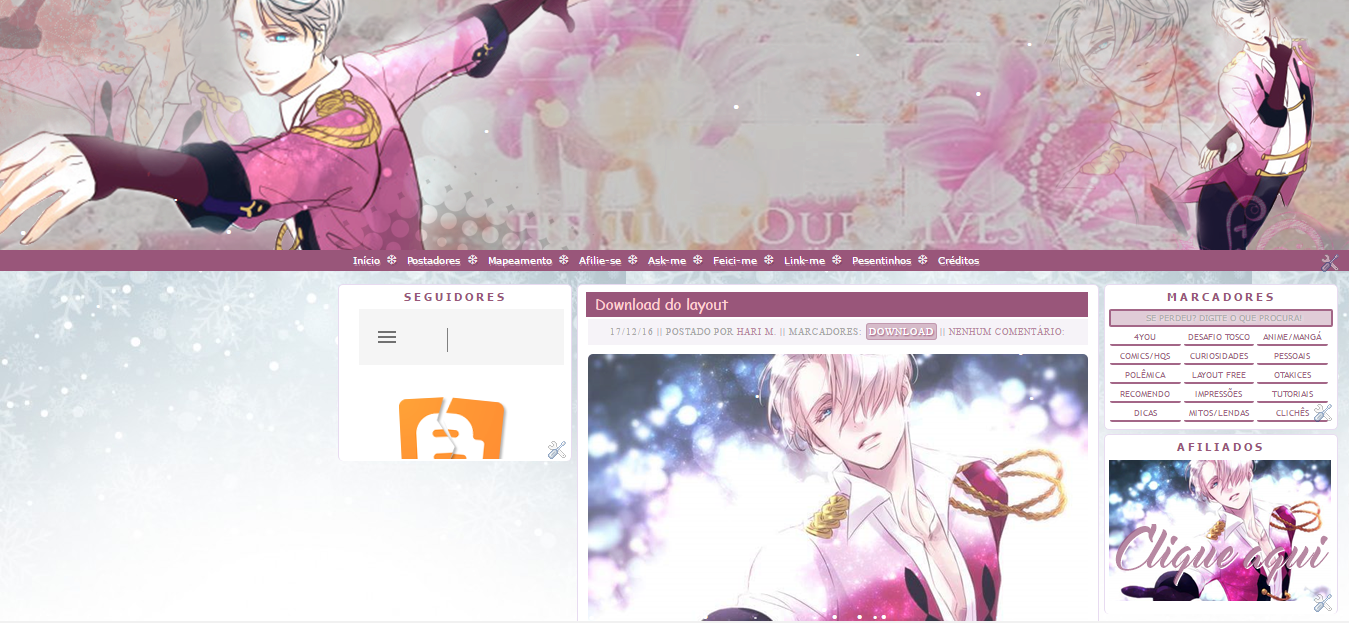 Oi pessoas bonitas! Eu tô disponibilizando o lay do Viktor porque achei que ficou lindo demais pra simplesmente ignorá-lo, e como não costumo publicar lays antigos do blog, dei uma leve mudada no cabeçalho, mas acho que nem vão perceber, só se colocar os dois layouts lado a lado. Eu ainda pretendo fazer mais um layout de Yuri on Ice, mas tá meio tenso lidar com os códigos, enfim... Podem ficar no aguardo. Eu só queria que vocês clicassem logo nesse botão porque eu já cansei de fazer essa introdução -tem horas que essa introdução minúscula, parece grande demais-.